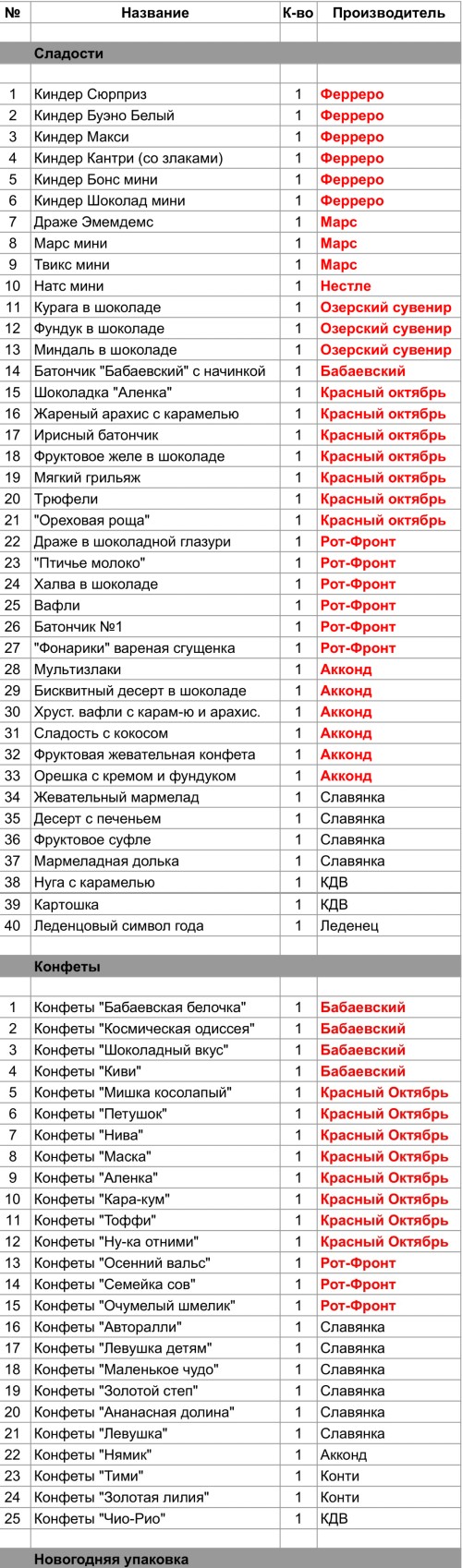 Шоколадка "Аленка" (1 шт), Жареный арахис с карамелью (1 шт), Ирисный батончик (1 шт), Фруктовое желе в шоколаде (1 шт), Мягкий грильяж (1 шт), Трюфели (1 шт), "Ореховая роща" (1 шт), Конфеты "Мишка косолапый" (1 шт), Конфеты "Петушок" (1 шт), Конфеты "Нива" (1 шт), Конфеты "Маска" (1 шт), Конфеты "Аленка"  (1 шт), Конфеты "Кара-кум" (1 шт), Конфеты "Toффи" (1 шт), Конфеты "Ну-ка отними" (1 шт)